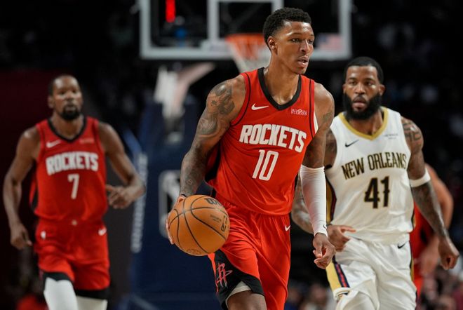 火箭前两场季前赛战胜老鹰与爵士收获2连胜,鹈鹕前两场季前赛战胜两支澳洲NBL球队收获2连胜。本场火箭缺少范弗利特、芬尼-史密斯与泰特,鹈鹕缺少穆雷、卢尼与奎因。首节开局火箭7-0领先,普尔三分命中,史密斯连得5分,鹈鹕连追5分。火箭罚中4球,鹈鹕一波6-2攻势追分,火箭连得4分,锡安暴扣引领6-2攻势追分。伊森暴扣,锡安连得4分与助攻贝暴扣,霍金斯也完成暴扣,首节结束火箭26-28落后鹈鹕。史密斯6中4得到11分,杜兰特4中0一分未得。